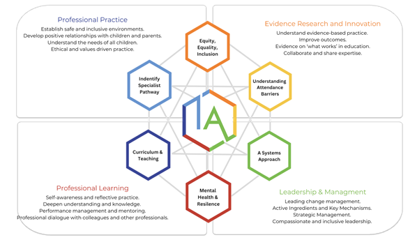 Our attendance approach is fundamentally guided by the Inclusive Attendance professional development model. Comprising six tailored Learning Modules, this model empowers us to deepen our understanding by facilitating continuous professional learning for all staff. Within this model, the four domains of practice ensure the provision of professional learning, professional development, evidence-based practices, and exemplary leadership and management to seamlessly integrate theory into practice.
